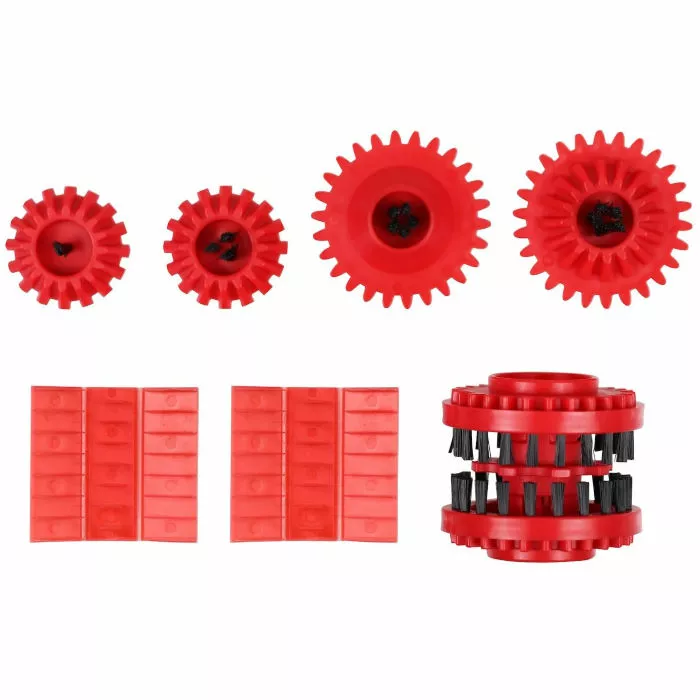 The Mangiacatena Replacement Kit is a genuine replacement parts kit for refreshing the internal parts on the Mangiacatena chain cleaner. It includes all brushes and the two lamellar elements, and it is easy to assemble for prolonged service life.
